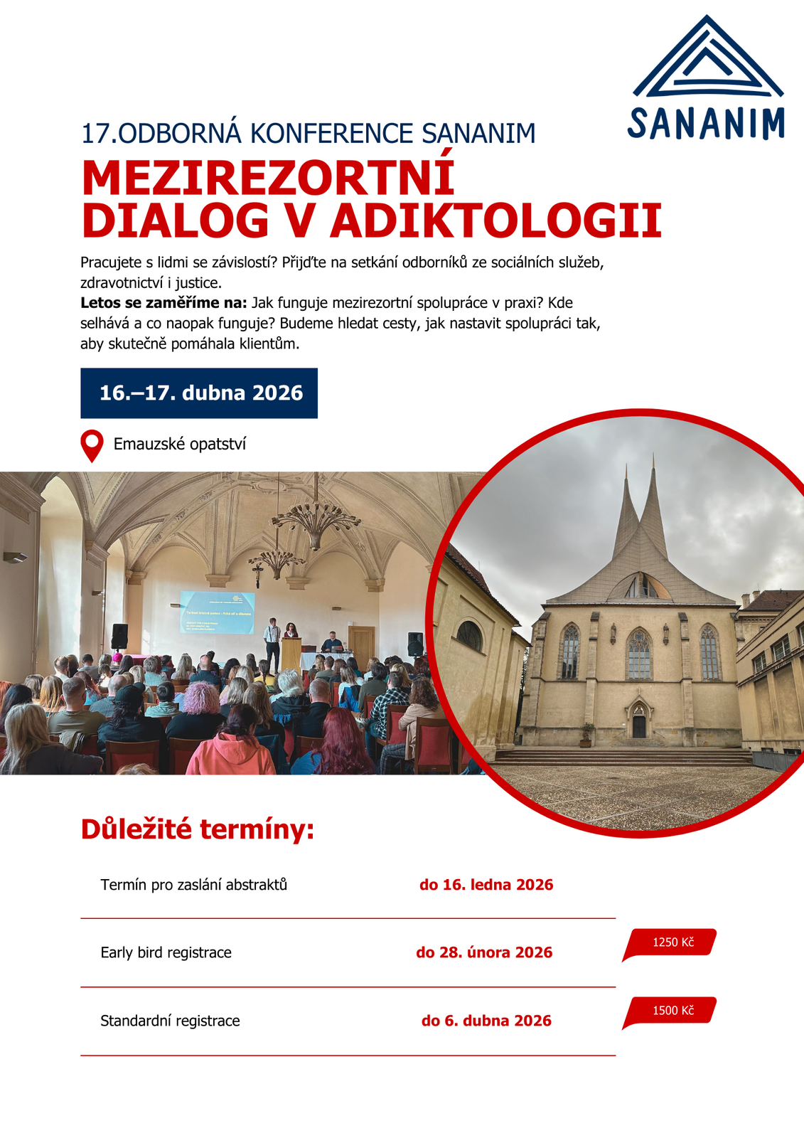 Pracujete s lidmi se závislostí a potýkáte se v praxi s tím, jak se (ne)daří propojit sociální služby, zdravotnictví a justici? Zapište si do kalendáře termín 17. odborné konference SANANIM, která letos nese podtitul Mezirezortní dialog v adiktologii. Setkáme se 16.–17. dubna 2026 v Emauzském opatství v Praze.
